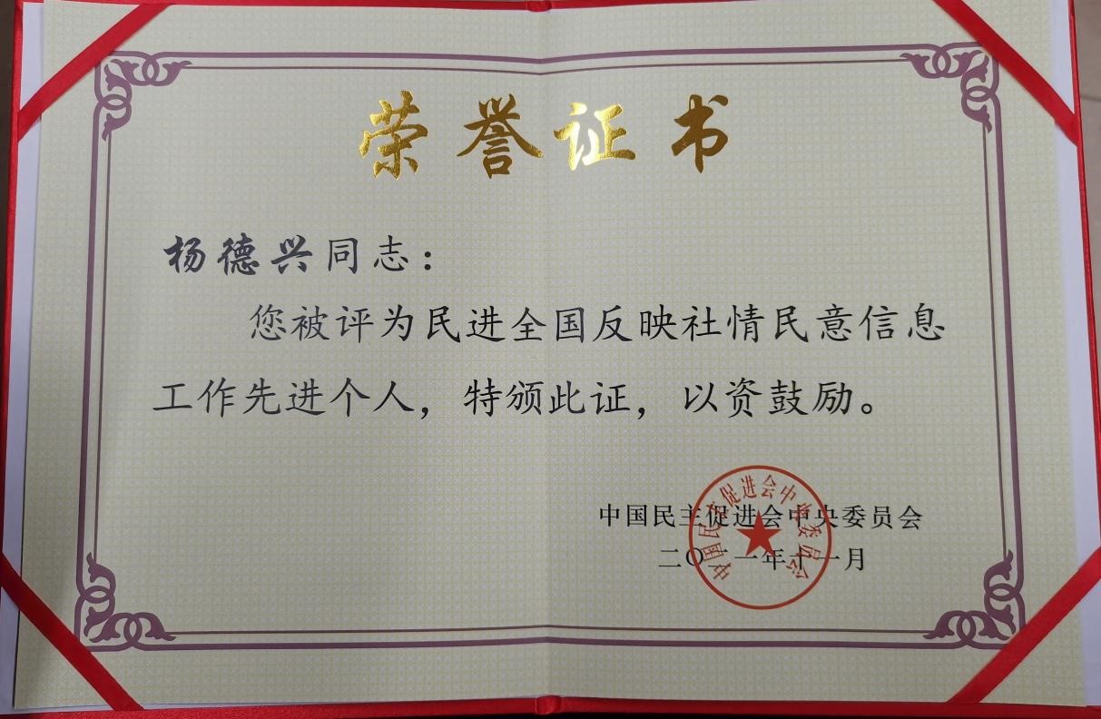 2021年是民进中央反映社情民意信息主题年。为树立典型、表彰先进,激励全会各级组织和广大会员进一步做好反映社情民意信息工作,民进中央于12月1日在北京召开反映社情民意信息主题年工作会暨2021年参政议政年会,对今年以来在反映社情民意信息工作中做出突出成绩的先进集体和个人进行了表彰。民进西工大总支主委、今年会官网教授杨德兴荣获2021年“民进全国反映社情民意信息工作先进个人”。