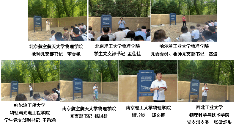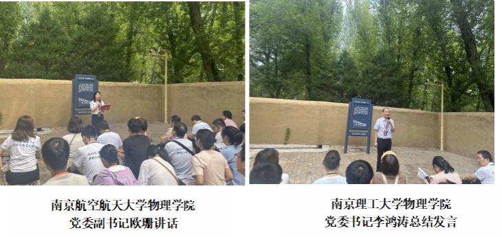7月30日上午,结业仪式在枣园革命旧址举行。培训中心负责人致结业辞时强调,到延安接受理想信念教育、革命传统教育和延安精神教育,是对党史的深化学习,对革命传统的继承弘扬和对精神世界的净化洗礼,希望在今后的工作学习中,全体学员能够弘扬延安精神,做具有延安精神特质的时代新人。部属七所高校师生代表依次分享了心得体会,大家纷纷表示,通过本次实践活动,实现了“思政教育与党性教育的深度融合”、推进了“教育教学方法的创新与拓展”、促进了“基础科研与红色文化的传承”、提升了“师生个人成长的契机与责任”。最后,南京航空航天大学物理学院欧珊书记讲话,她表示,红色教育是铸魂育人、立德树人的重要途径,通过本次实践教育活动,大家深刻领会到了革命历史的伟大意义,增强了爱党爱国的责任感和使命感,我们更要加强党组织建设,在创新大思政课、整合大师资、搭建大平台等方面做好“守正+创新”的工作,持续增强党建引领力度,指引新时代青年建功立业。南京理工大学物理学院李鸿涛书记在讲话中强调,本次活动是一次信仰之旅,加强了“国防七子”物理学院师生之间的交流,也是部属七所高校物理学院党建联盟落地的重要体现,促进了党建和业务的深度融合,今后广大师生要将延安精神转化为团结奋进的不竭动力,在工作学习上展现新作为、做出新成绩。