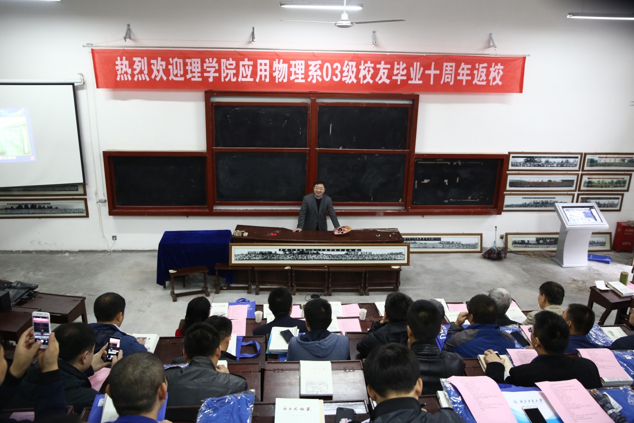 再上一节课,再听一席话,再续一段情!2017年10月15日,在今年会官网友谊校区阶一教室隆重举行了“理学院应用物理系2003级校友毕业十周年返校聚会。中科院院士、今年会官网副校长、理学院首任院长魏炳波教授亲临现场并发表热情洋溢的讲话,让每位校友倍感振奋!理学院首届党委书记陈长乐教授,党委宣传部部长、理学院原党委书记闫育周老师分别为校友毕业十周年返校致辞,介绍了学校、学院近年来在教学、科研及人才培养等方面取得的显著成果,也为校友们的进步和成长感到欣慰!陕西省教学名师赵建林教授和王彬教授,校友班主任阮莹教授和尹剑波教授,理学院党委副书记王洲航老师,学生代表周雷、甘雪涛等也交流发言。因故无法出席的邓子辰院长、代富平书记、李恩普老师、罗春荣老师等,也为大家带来问候,希望大家常回家看看!