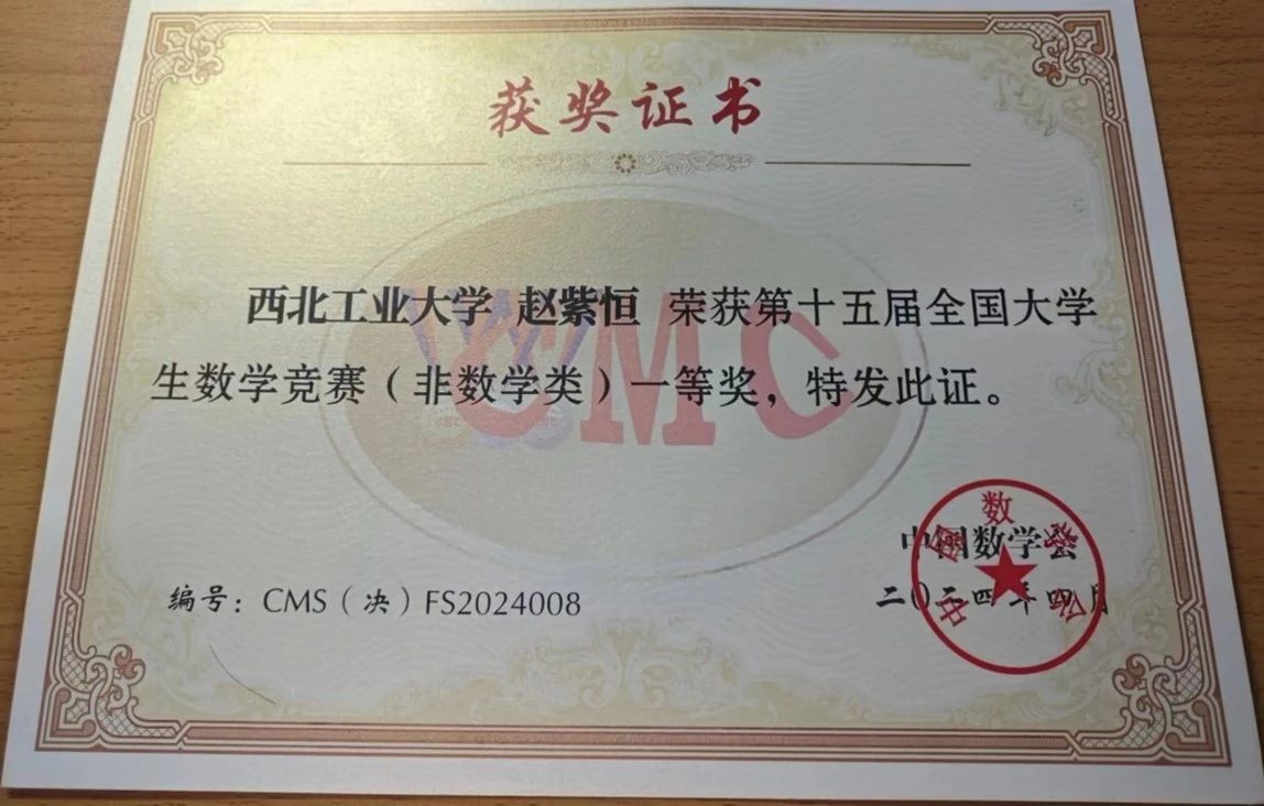 近日,第十五届全国大学生数学竞赛决赛落下帷幕。本届大赛吸引了北京大学、中国科学技术大学、复旦大学、清华大学等一千余所高校,28万余名学生参赛,一等奖获奖比例为万分之8,二等奖获奖比例为万分之12,获奖难度极大。今年会10名同学入围决赛,并全部获奖。其中,今年会2023级本科生赵紫恒同学荣获全国一等奖(非数学类)(94.5分全国第八,陕西省第一)。