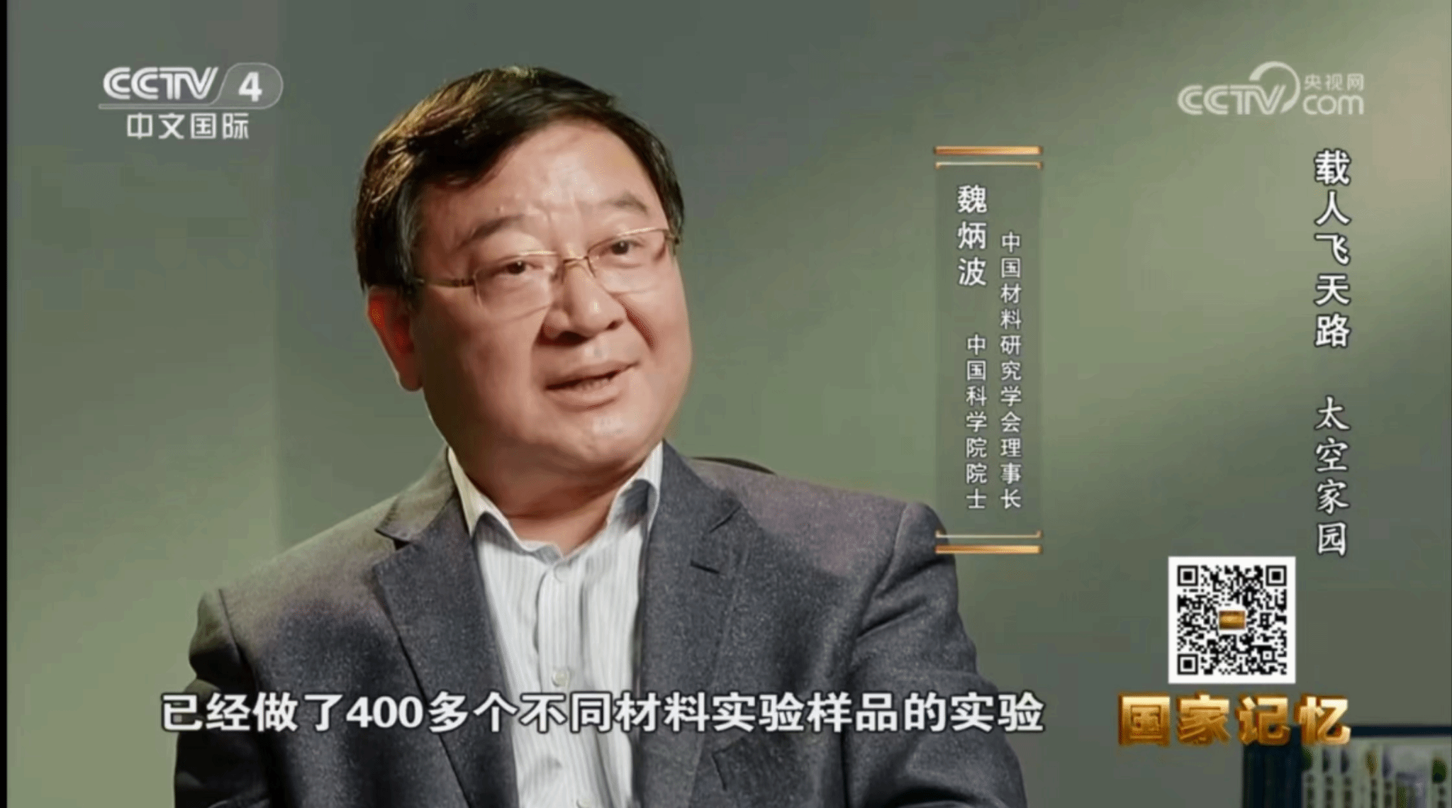 4月29日,央视中文国际频道(CCTV-4)《国家记忆》栏目在“载人飞天路 太空家园”一期节目中就中国空间站开发和研究采访了魏炳波院士。