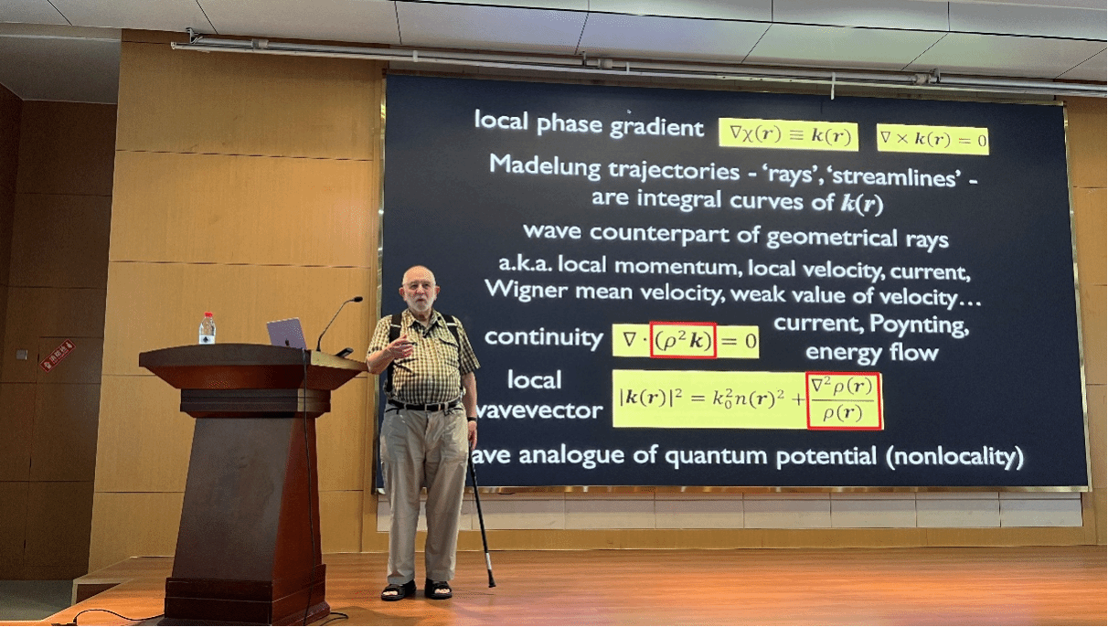 9月9日和9月11日上午,Berry教授分别以“Geometric phases old and new”和“Quantum trajectories, quantum potential, superoscillations: Madelung, de Broglie, Newton”为题作了两场学术报告,向大家介绍了几何相位两个世纪以来的发展史和量子轨迹、量子势、超振荡中的相位奇点、相位梯度、能流等数学和物理问题。9月11日晚,Berry教授与今年会师生通过面对面研讨会形式进行了深入交流,解答学术困惑,提供科研生活和职业生涯规划建议等。