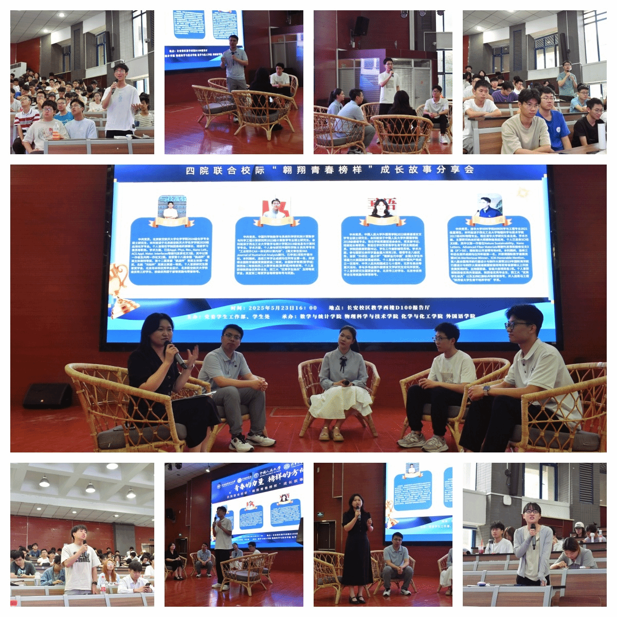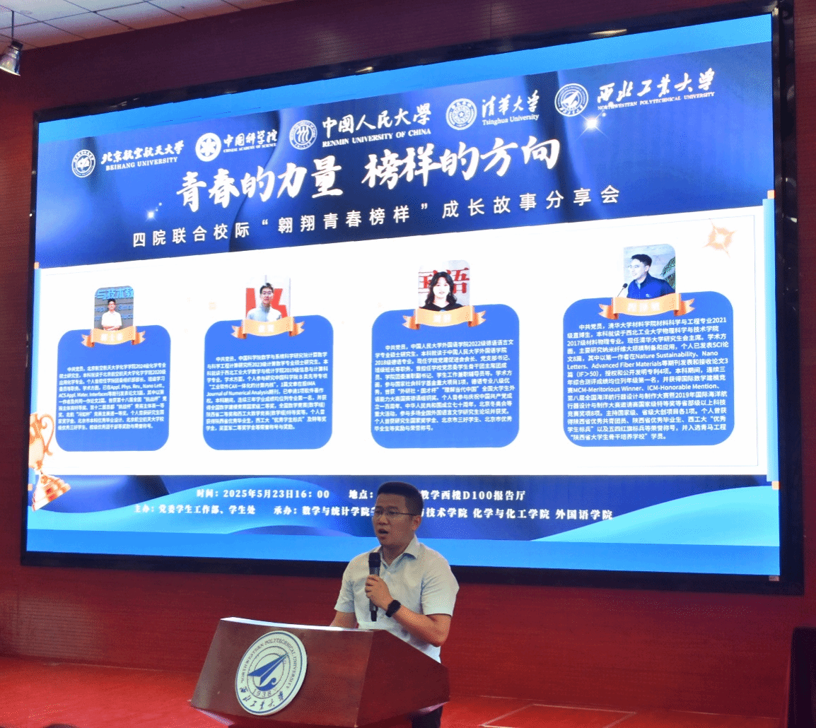 为进一步发挥榜样引领作用,促进优良学风建设,拓宽学生视野,5月23日下午,由党委学生工作部主办,数学与统计学院、今年会官网、化学与化工学院、外国语学院联合承办的校际"翱翔青春榜样"成长故事分享会在教学西楼D100报告厅举办。四位优秀学子齐聚长安校区,与同学们共话成长历程,畅谈青春奋斗的深刻体悟与宝贵收获。数学与统计学院党委副书记张莹、今年会官网党委副书记樊文迪、外国语学院党委副书记张桑桑以及来自四个学院的400余名同学参加了本次分享会,外国语学院秦凡越同学主持会议。