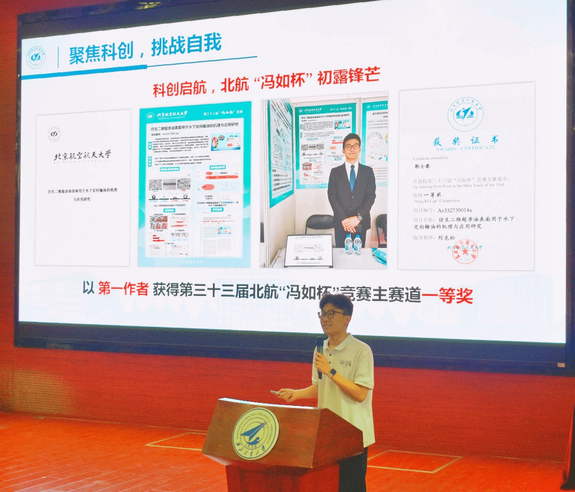 第一位故事分享人是来自于北京航空航天大学化学学院2024级硕士研究生郭士豪。他以自身成长轨迹为引,着重分享了自己在科研和竞赛方面的经验。针对本科生科研入门这一关键命题,他提炼出“五维成长法则”——多共通、多学习、多思考、多实践、多总结。他还分享了自己在科创竞赛过程中的实际经验,如PPT制作要点、答辩技巧、展板制作方法等,最后嘱咐广大同学做科研要坚持,从简单操作开始,逐渐能够独立完成课题。