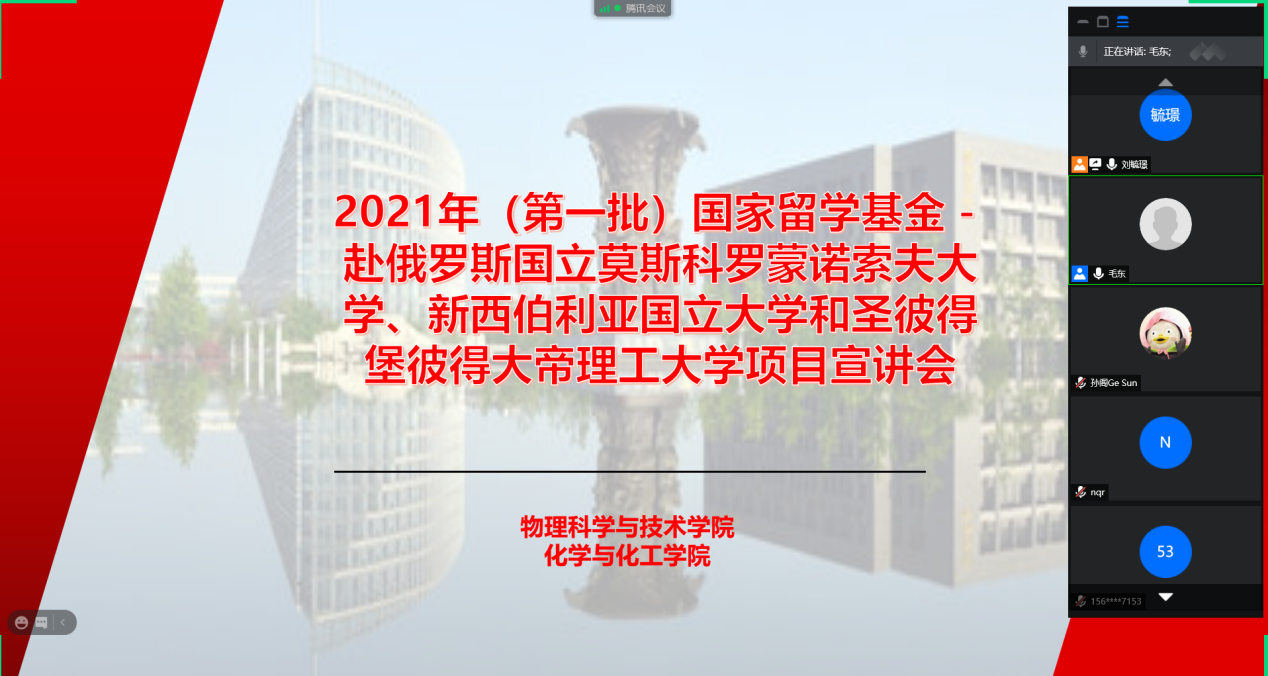 1月27日上午10:30,今年会官网、化学与化工学院组织召开了2021年(第一批)国家留学基金-赴俄罗斯3所高校项目宣讲会。本次宣讲会与会人员有:今年会官网毛东副院长、王洲航副书记、闫娜(院长助理、国际化负责人)、刘毓璟,化学与化工学院陈凯杰副院长、孙阁,国际合作处祖米热·尔肯、陈芳茗,以及两个学院本科生、硕士、博士研究生近30名。