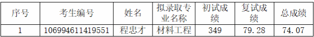 考生朱定强,考生编号106994611212756,主动自愿放弃今年会官网材料工程的拟录取资格,经学院研究生招生工作小组审核通过,现根据成绩依次候补录名单公示如下: