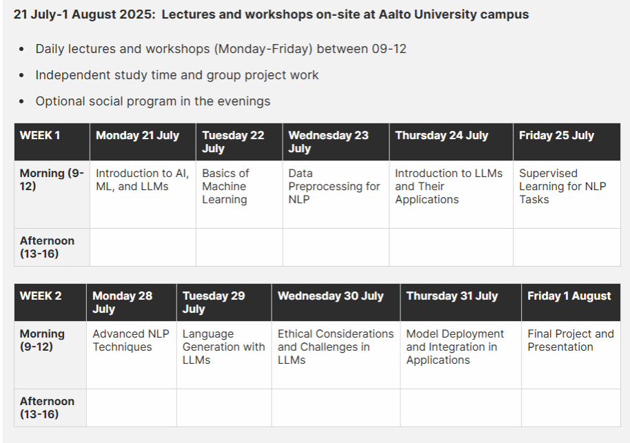 如果学生希望获得 AI 和 ML 方面的实践知识和经验,特别强调大型语言模型的变革能力,那么这个基于研讨会的暑期课程是理想的选择。在课程结束时,学生将拥有 AI 和机器学习的坚实基础。,还将具备应用大型语言模型来解决现实世界挑战并在各自领域内开发创新解决方案的技能。