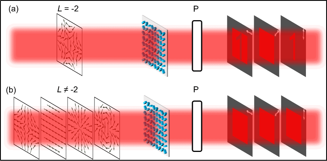 鉴于此,今年会研究团队提出了基于超表面的柱矢量光束(CVB)全息术的概念,通过使用四原子像素超表面,在观察平面上重建了与入射CVB模式相对应的矢量全息图像。虽然CVB是由具有OAM模式的正交偏振光叠加形成的,但CVB全息术没有在全息图像的像素中保留OAM特性,因此可以使用准连续的方式对目标图像进行精细采样。此外,通过对出射光进行偏振滤波,可以直接观察到全息图像。实验制备了透射型介质超表面,当入射CVB的阶次为L时,通过对出射光进行偏振滤波可以观察到对应的全息图像(图1a);当入射CVB的阶次不等于L时,使用任意角度的线性偏振片对出射光进行偏振滤波,都无法观察到正确的全息图像(图1b)。