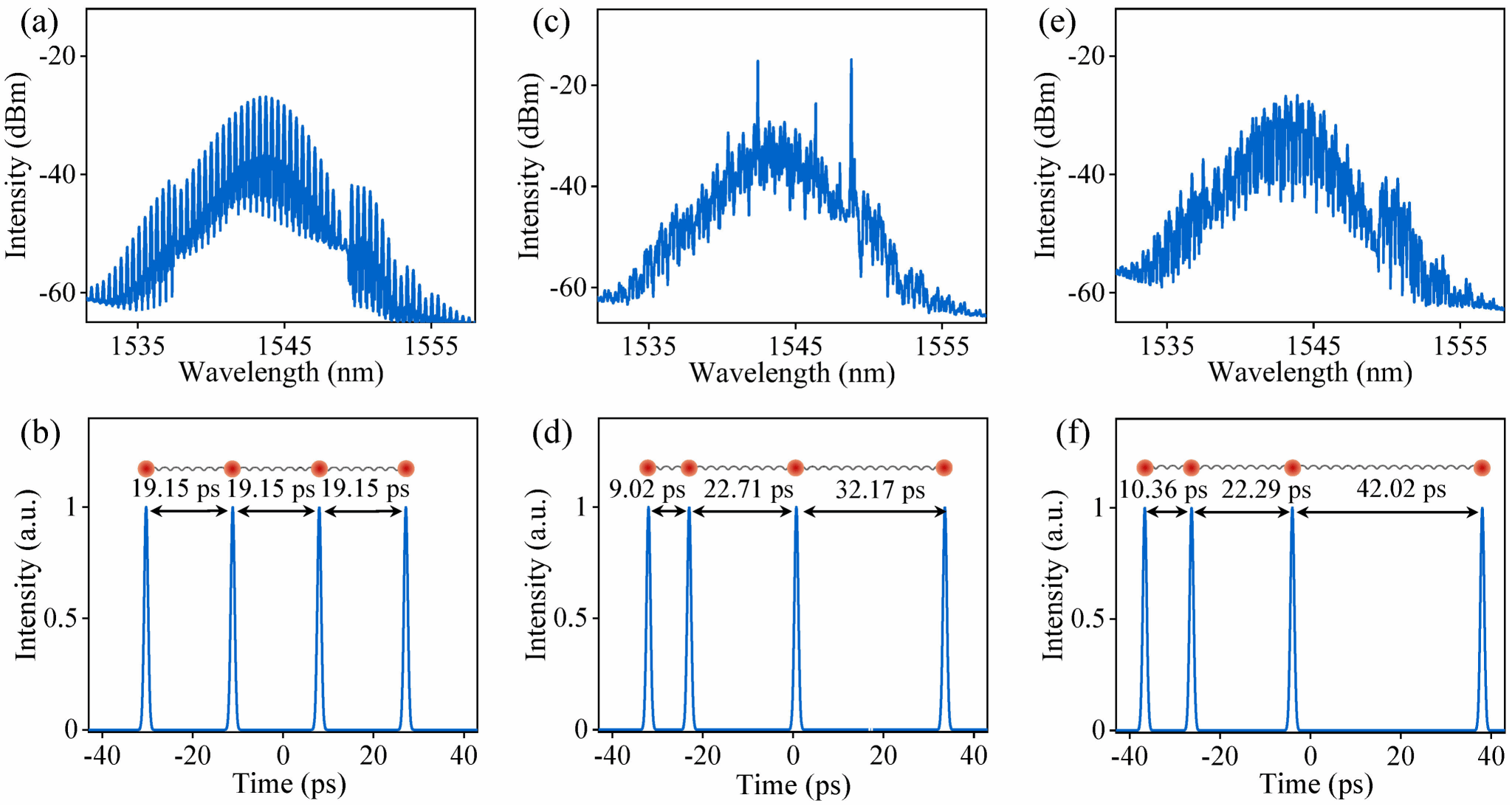 超短激光脉冲具有皮秒至飞秒量级的持续时间,是非线性光物理和超快科学研究的基础。在锁模激光器中,增大泵浦功率会导致脉冲累积过量的非线性相移而发生分裂,进而形成多脉冲。目前,科学家们提出了增益管理、偏振优化等方法来实现双脉冲间距的主动调控。受色散波、交叉相位调制、脉冲相互作用等因素的影响,多脉冲的间距和时域分布难以定量控制。