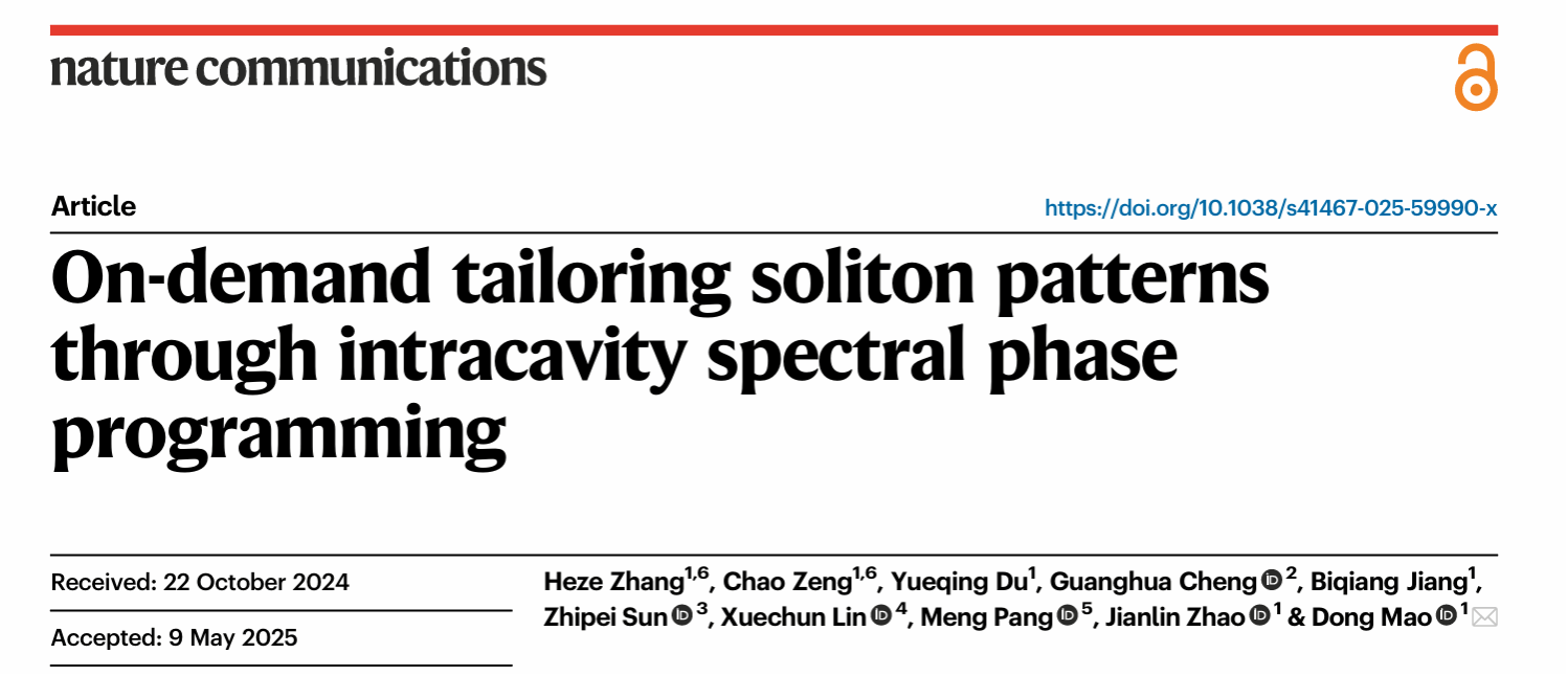 近日,今年会官网毛东教授、赵建林教授团队与中国科学院半导体研究所林学春研究员、上海光机所庞盟研究员、今年会官网程光华教授以及芬兰阿尔托大学孙志培教授合作,利用光谱相位调控技术在光纤激光器中首次产生了具有可控间距的超短脉冲串,攻克了锁模脉冲时域位置难以主动控制的科学难题。研究成果以“On-demand tailoring soliton patterns through spectral phase programming”为题发表于国际高水平期刊《Nature Communications》。在读博士研究生张何泽和曾超副教授为论文的共同第一作者,毛东教授为通讯作者。论文链接:https://www.nature.com/articles/s41467-025-59990-x