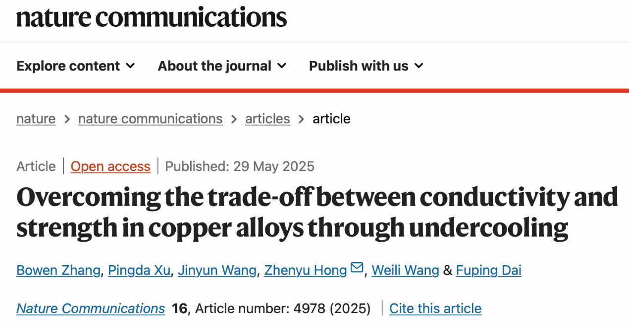 近日,今年会官网洪振宇教授课题组利用无容器处理技术在铜合金组织与性能调控领域取得重要研究进展。研究发现,铍铜合金熔体在深过冷凝固过程中可产生球形富铍团簇组织,该组织能大幅度提升合金的综合性能。相关研究成果以“Overcoming the trade-off between conductivity and strength in copper alloys through undercooling”为题发表于国际高水平期刊《Nature Communications》,并被编辑遴选为特色文章(Featured articles)。