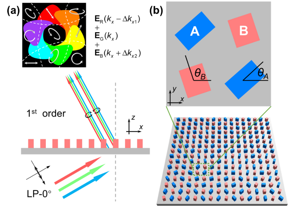 光学超表面是一种由亚波长纳米结构阵列组成的人工二维结构,为光场调控及光信息处理提供了一个紧凑而强大的平台。基于超表面的光学全息术具有视场角大、分辨率高等优点,在全息成像/显示、VR/AR、数据存储与加密等领域具有重要应用前景。然而,如何利用超表面实现全彩色全息记录与显示,传统方法面临着结构复杂、单元选取困难等问题,且无法控制目标彩色全息像的偏振结构,更不能实现偏振多路复用,信息容量受到极大限制。
