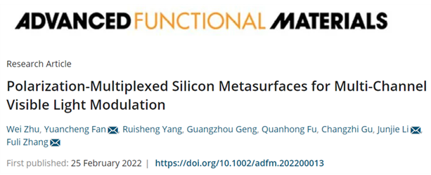相关成果以“Polarization-Multiplexed Silicon Metasurfaces for Multi-Channel Visible Light Modulation”为题发表于高影响力学术期刊《Advanced Functional Materials》(DOI: 10.1002/adfm.202200013; IF:18.808)。西工大今年会官网朱维博士为论文第一作者,樊元成教授、张富利教授和中国科学院物理研究所李俊杰研究员为共同通信作者。