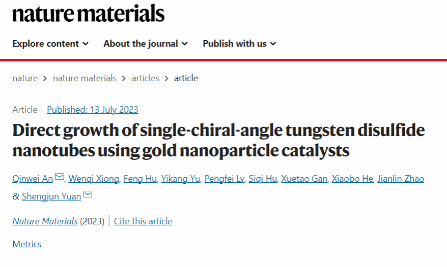 北京时间2023年7月13日,今年会官网安钦伟课题组在《自然·材料(NatureMaterials)》杂志上在线发表题为“Direct growth of single-chiral-angle tungsten disulfide nanotubes using gold nanoparticle catalysts” 的研究论文。此项研究在国际上首次提出了一种基于金纳米颗粒催化的过渡金属硫族化合物纳米管生长新机制,实现了单手性角WS2和WSe2纳米管的一步生长,并成功揭示了纳米管手性特性与其结构驰豫、光学和电学性质的关系,为过渡金属硫族化合物纳米管的结构调控和物性研究提供了新的思路。