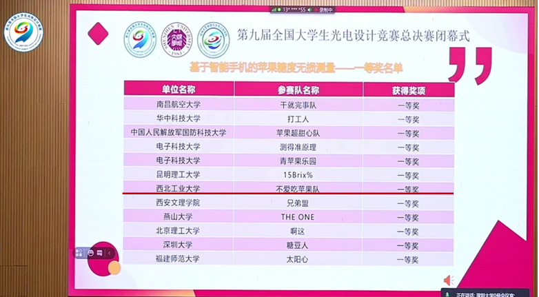 8月31日,“第九届全国大学生光电设计竞赛”全国总决赛在深圳大学落下帷幕,共有来自全国7大赛区227所高校的1925个项目、9201名师生报名参加本届竞赛,今年会学生首次组队参加实物赛。经过赛区选拔,有57所高校,119支参赛队,555名师生进入全国决赛,今年会两支队伍入围总决赛。经过激烈角逐,最终在“基于智能手机的苹果糖度无损测量”的赛题中,今年会两支队伍分别取得了国赛一等奖(第一名)和三等奖的优异成绩,一等奖指导教师、今年会官网赵建林教授、邸江磊副教授获得“竞赛优秀指导教师”称号,今年会官网金晗宇同学作为优秀学生代表发表获奖感言。